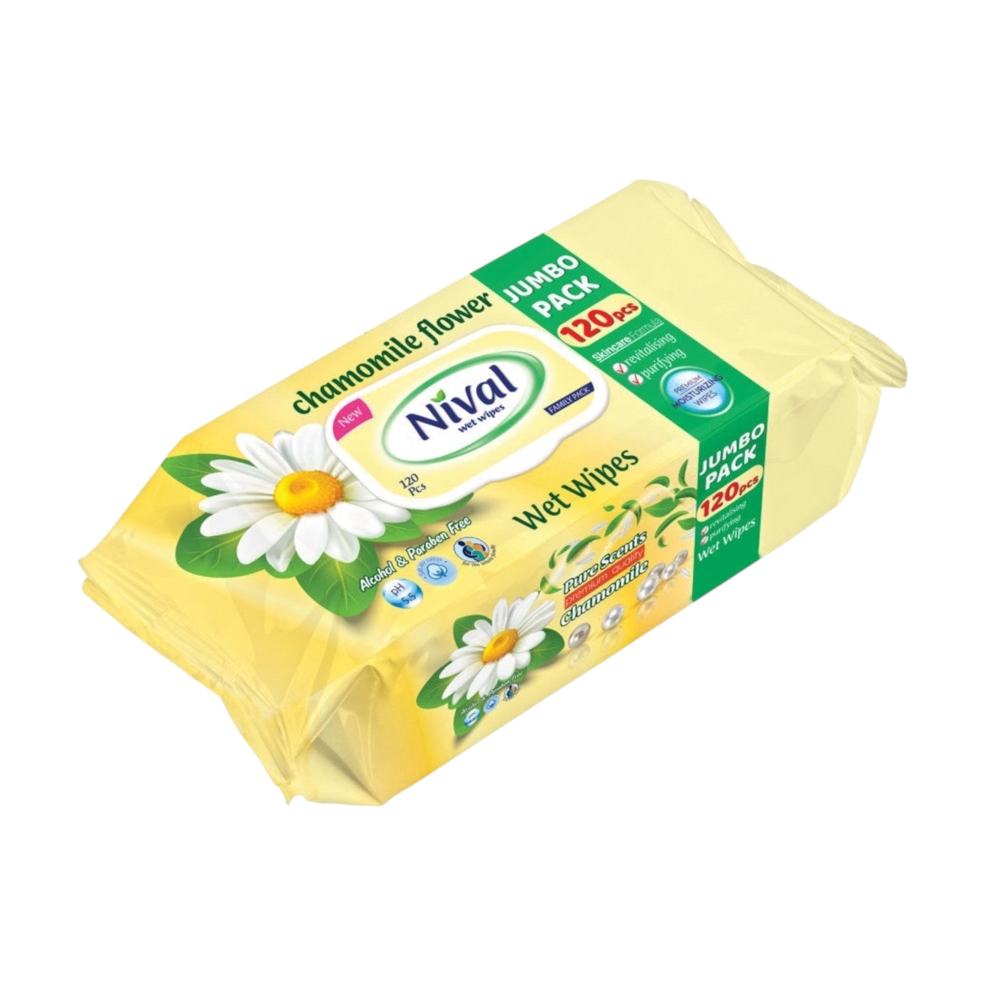 Nival Wet Wipes feature a gentle chamomile formulation specifically developed for sensitive skin. These dermatologically-tested wipes provide thorough cleansing without causing irritation, leaving skin feeling soft and refreshed. The allergen-free composition makes them suitable for daily use across all skin types, while the convenient 120-count package ensures long-lasting value.